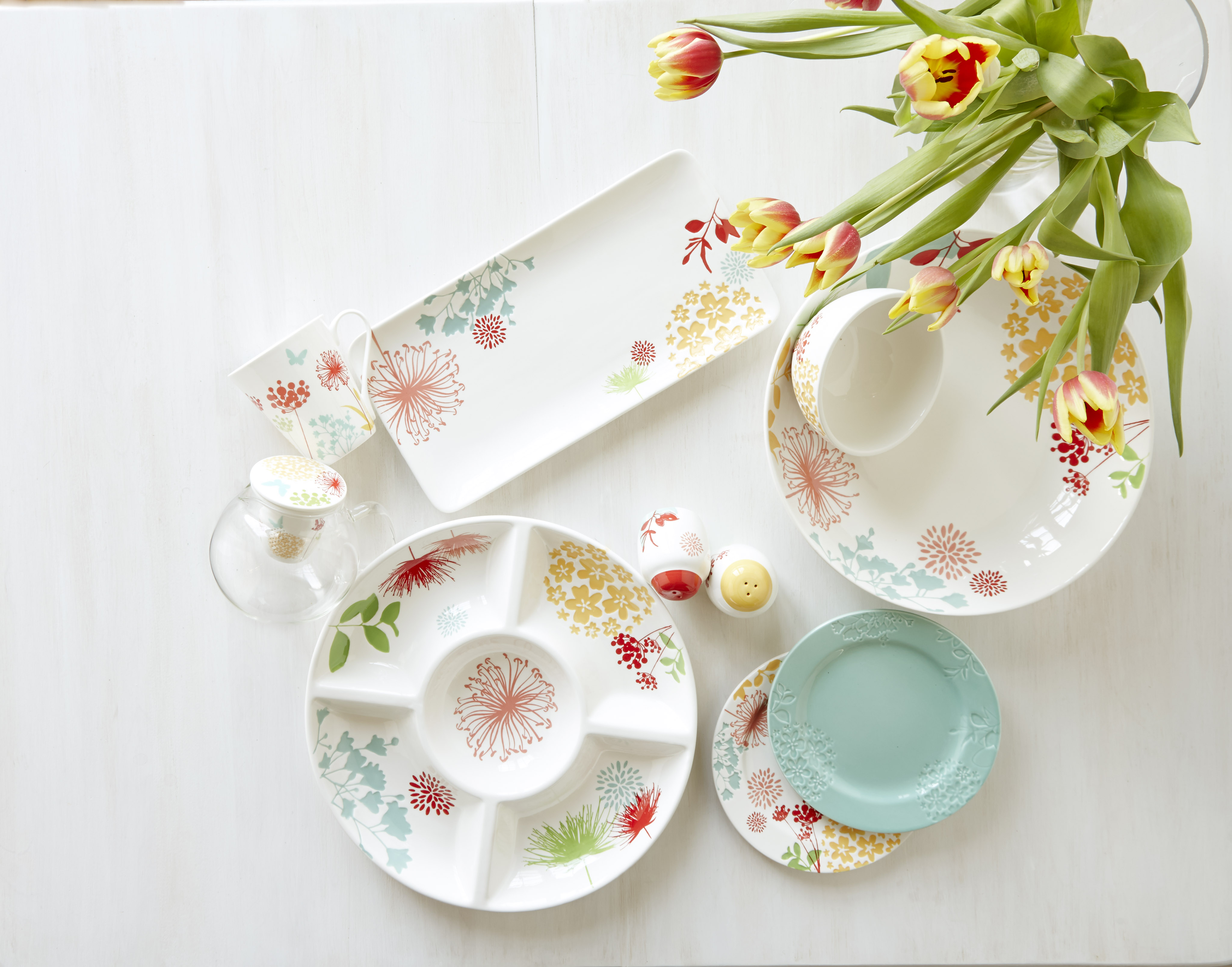 Maintenant que nous nous sommes occupés des boissons, il est temps de passer à la nourriture. Notre collection de plats de service Wild Flower est parfaite pour cette saison. Elle est composée de 5 plats et cette collection s’agence avec n’importe quel menu. Le plateau de service rond de 5 morceaux est parfait pour servir des légumes et le plateau rectangulaire est parfaot poir servir des entrées et des desserts.