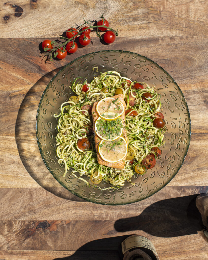Vous aimez manger santé, mais vous avez l’impression d’avoir fait le tour de toutes les possibilités? Voici les nouilles de zucchini! Faciles à préparer, super savoureuses et une façon amusante de manger des légumes, elles sont l’accompagnement parfait d’une protéine rôtie comme ce saumon alléchant.
