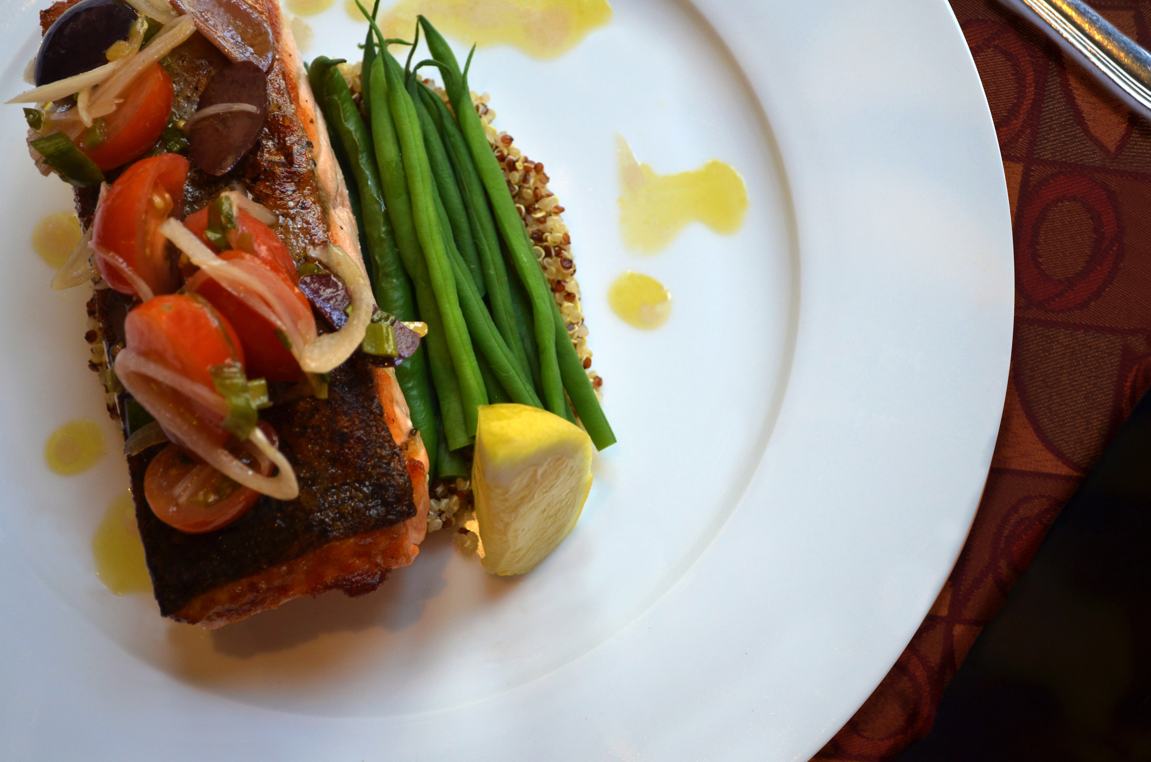 Dresser la salade de quinoa dans chaque assiette et placer le saumon sur la salade, arroser légèrement du jus obtenu lors de la cuisson, finir avec la salade de haricots verts légèrement assaisonnée de jus de citron et échalotes vertes.