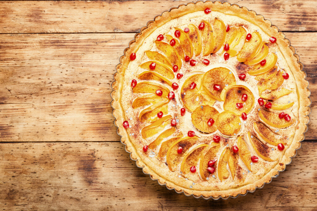 La tarte aux kakis est le délice parfait de la saison hivernale. A la fois simple et élégant, le glaçage au miel magnifie les attributs sucrés naturels du kaki, et la garniture à la frangipane ajoute un joli contraste de texture à la pâte à tarte aux amandes.